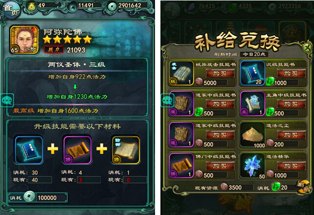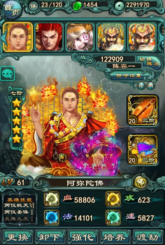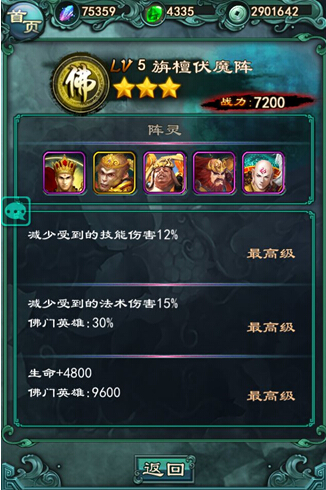 度 过前期的缺衣少食,中期应该考虑阵法的问题,并且自己也应该明确自己发展方向,四大阵营,佛妖偏重法系,巫道偏重攻击。各投资也有所不同,但是量力而行, 我的小V 只够玩佛,佛阵性价比相对较高,阵法英雄可以刷出,耗点时间,完全可以把三星佛阵满级,然后以此过渡。当然看个人财力和喜好。阵法激活不需要消耗英雄法 宝,但是强化是要消耗的,升到5级(阵法属性为初始属性的三倍)需要三套阵法英雄法宝。所以,中期应该是一个瓶颈,推图也会频频卡壳,这时候也就是优化阵 容,培养英雄,更换法宝,但是主要方向还应该是储备资源,借助游戏活动(四阵营轮换,各一周,每周二例行更新,顺序为妖—佛—巫—道)强化阵法。阵法的作 用是毋庸置疑的,无论是属性加成还是抗性加成,效果都是极为明显的。