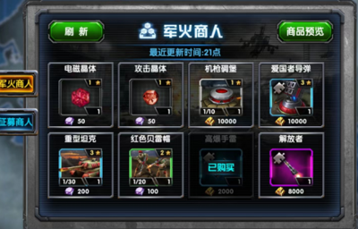 军火商人:军火商人的物品都相对较贵,但是以下物品是值得购买的:一是蓝装碎片,2000金币购买一个碎片,20个碎片合成一件蓝装分解后获得高低晶石升级装备,很划算。这个购买可以配合商店购买任务和获得装备碎片任务来完成。二是部队,像200钻一个磁暴兵还是很划算的,平民玩家在发展前期可以考虑购买。其他物品不建议购买。